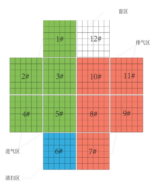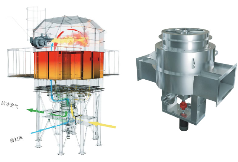 采用风机对吹扫区进行吹扫,防止未净化的气体在进气区转入排气区时排走。盲区是不通气的,即从排气区转入进气区时,防止气体混合。通过旋转阀的旋转,各个区的陶瓷填充床均做加热、冷却、净化的循环步骤,完成气体的净化功能,并回收热量。