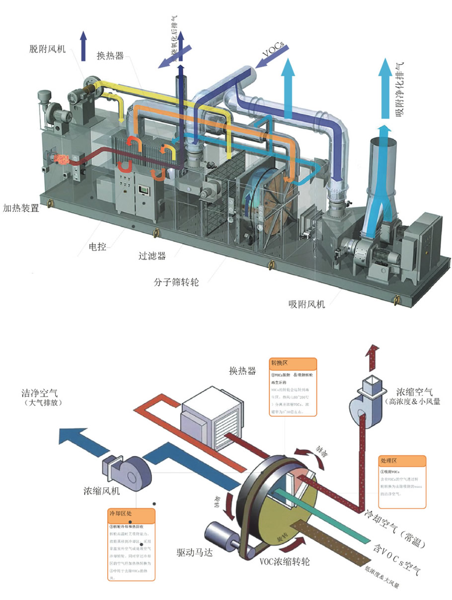 待处理(附带溶剂)空气经过沸石转轮时,气流中的VOCs被疏水沸石吸附。随后洁净的空气通过转轮排放到大气中。沸石转轮不停旋转,将吸附的VOCs转到脱附区域。在脱附区域内,吸附在沸石转轮上的VOCs被一股加热的气流脱附,这股气流占总处理风量的5-10%。之后,已脱附的转轮转回处理区域。